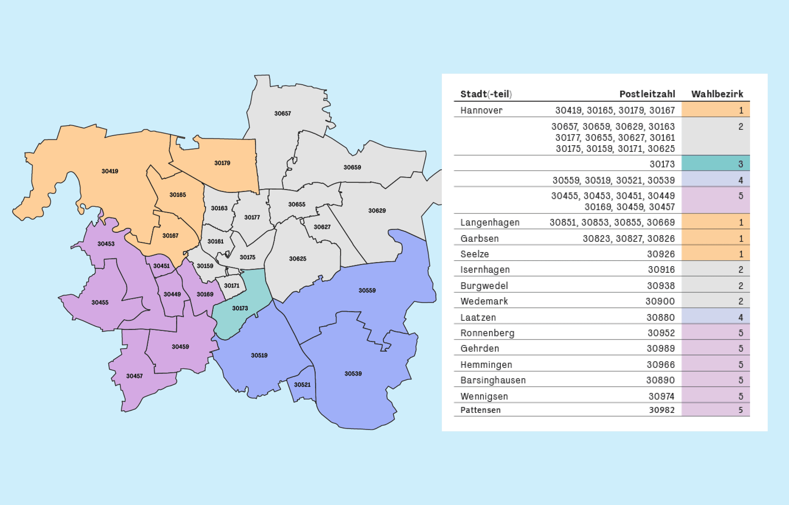 Unsere Mitglieder sind verschiedenen Wahlbezirken zugeteilt. Jeder dieser Bezirke entsendet eigene Vertreterinnen und Vertreter, die die Interessen der Mitglieder in der Vertreterversammlung vertreten. Jede Vertreterin und jeder Vertreter wird dem Wahlbezirk zugeordnet, in dem sich ihre bzw. seine Wohnung befindet. Hat ein Mitglied seinen Wohnsitz im Ausland oder beginnt der PLZ-Bereich nicht mit der Ziffer 30, wird es automatisch dem Wahlbezirk 3 zugeteilt. Anhand der Übersichtskarte können Sie erkennen, welchem Wahlbezirk Ihr Wohnort zugeordnet ist und in welchem Gebiet eine Kandidatur für Sie möglich ist.